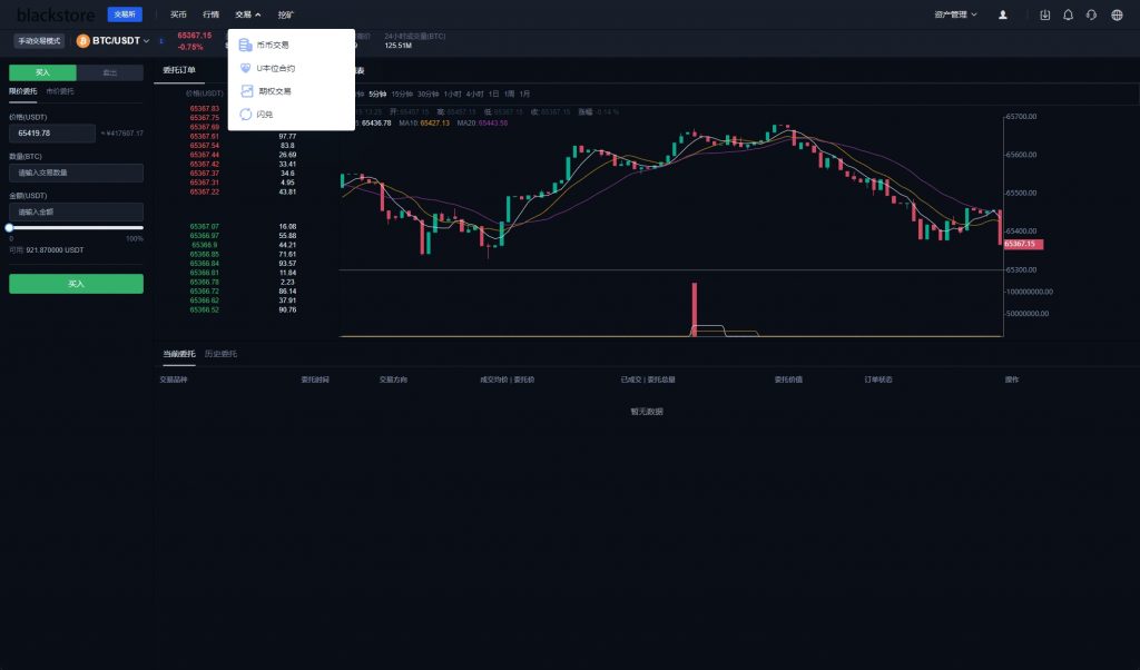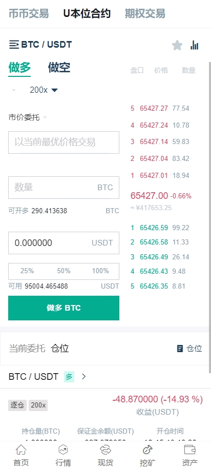 系统功能包括:币币交易、U本位合约、期权交易、挖矿、兑换等多种功能。
